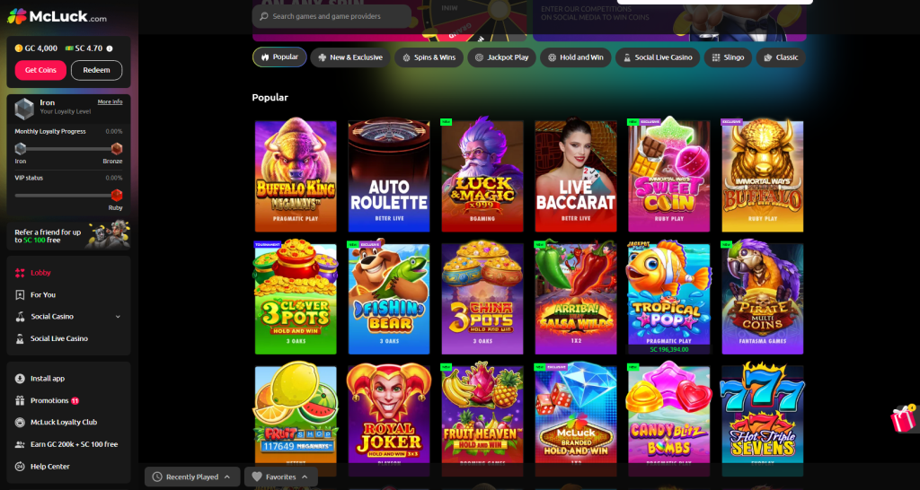 McLuck Casino provides a comprehensive and engaging online gaming experience, marked by an extensive array of games from top-tier software providers, a user-friendly dual currency system, and robust customer support. The platform caters to a wide range of players through its diverse game selection, including slots, table games, and unique offerings like Slingo. Its innovative virtual currency system, which includes Gold Coins for fun play and Sweepstakes Coins for real prizes, adds an exciting dimension to gameplay. Additionally, the casino ensures ease of access and seamless gameplay across various devices, from desktops to mobile phones.
